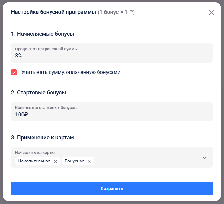 Нажмите на кнопку «Настройки бонусной программы» в правом верхнем углу. Откроется окно параметров бонусной программы.