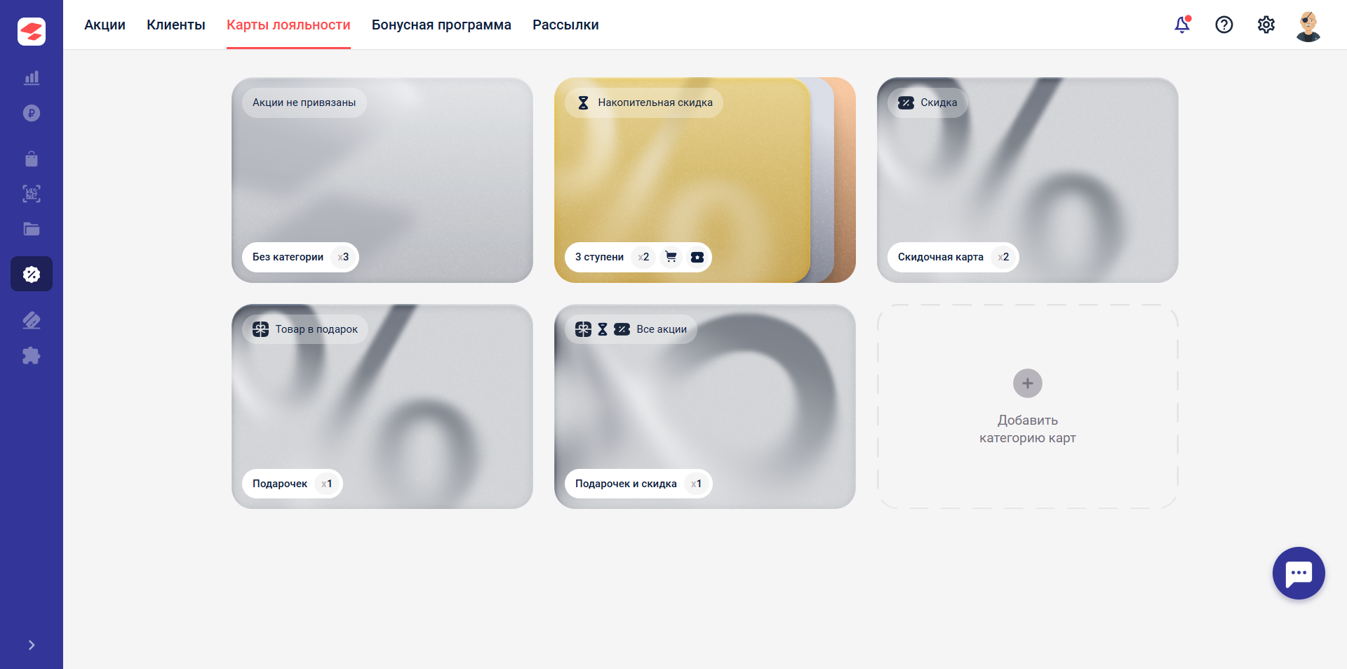 Типы карт лояльности позволяют предоставлять клиентам различный уровень скидок. Все имеющиеся типы отображаются в виде карт, с указанием названия типа и количества выпущенных (выданных клиентам) карт.