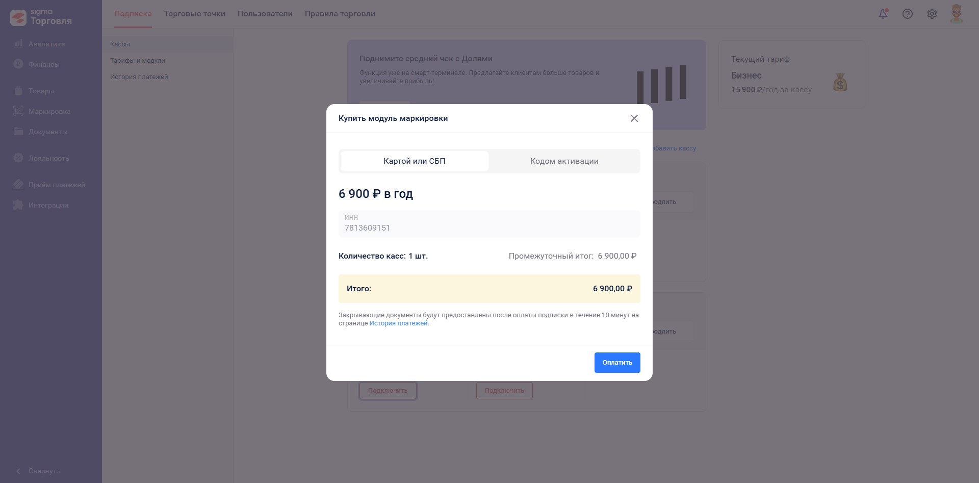 Для покупки модуля «Маркировка» нужно в Личном кабинете Sigma Облако зайти в раздел «Настройки» и нажать кнопку «Купить» у нужной кассы.