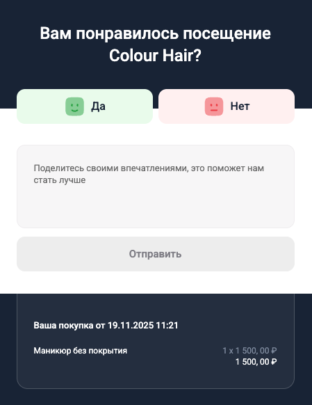 Клиенту на почту придет письмо с благодарностью за визит и со сcылкой на форму обратной связи.