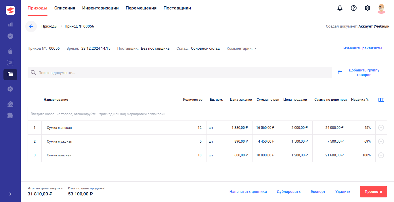 Перейдите в раздел «Документы» и на вкладке «Приход» нажмите «Создать приход».