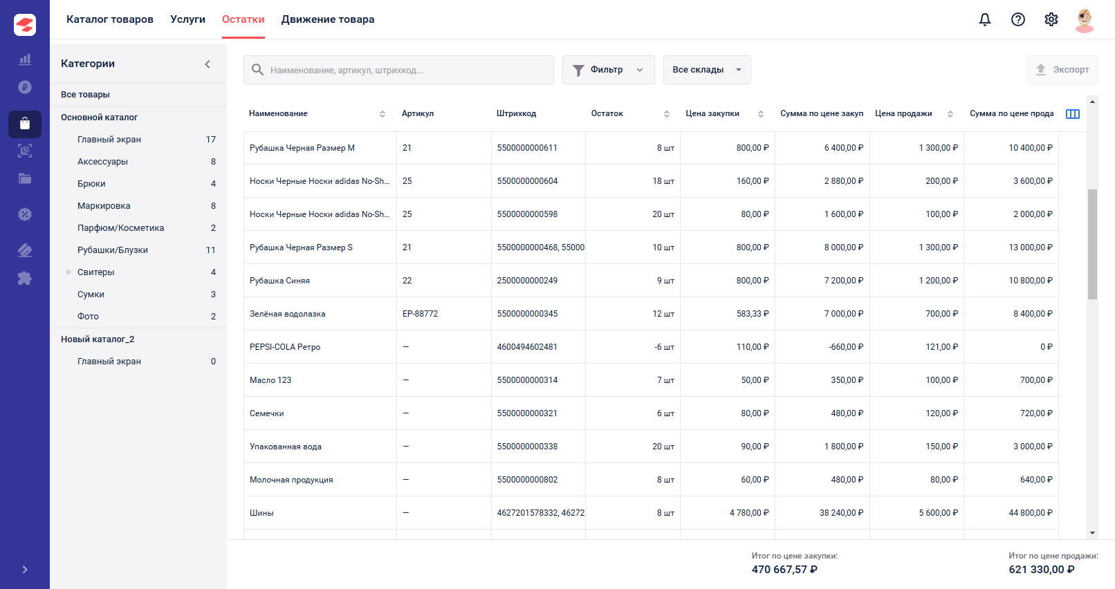 Рекомендация: Используйте поиск, фильтры или категории для удобства просмотра остатков по товарам. Сводные суммы внизу таблицы, подскажут сколько денег вморожено в склад.