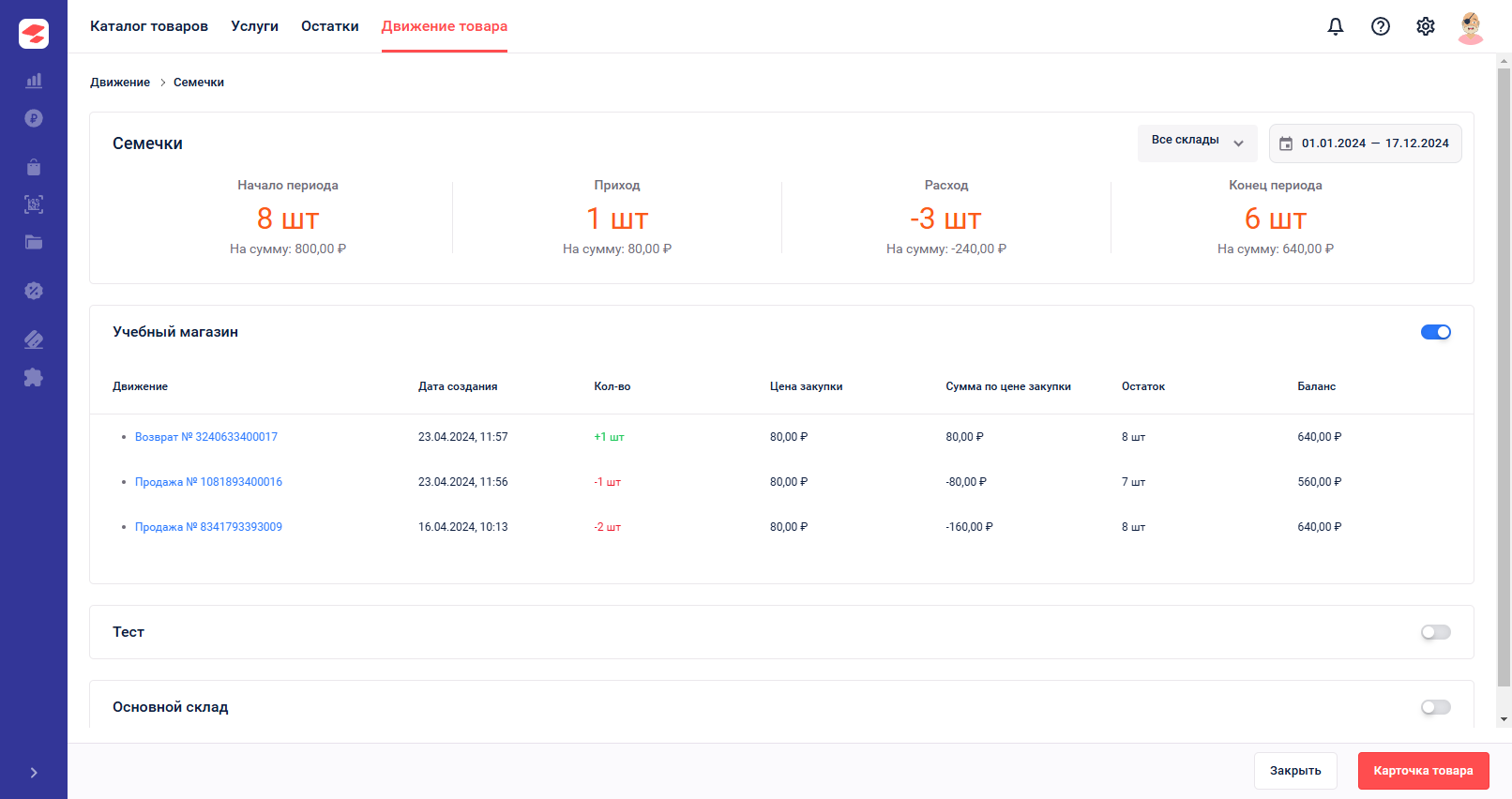 Найдите товар через поиск и просмотрите его историю: пополнения, инвентаризации, продажи.