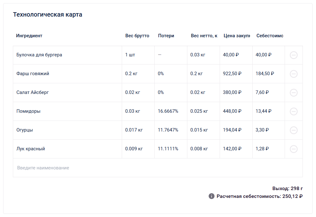 Система автоматически рассчитает себестоимость блюда, если ингредиенты были оприходованы с указанием себестоимости.