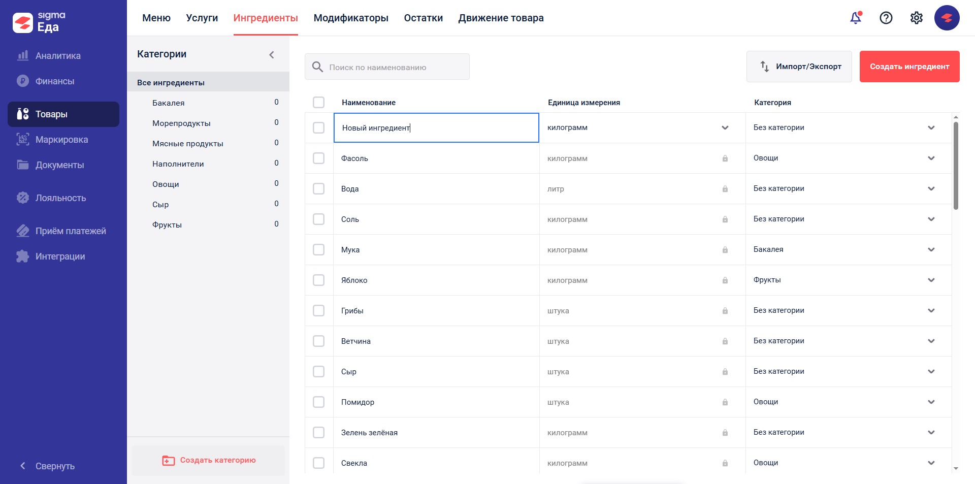 - Перейдите в раздел «Товары», вкладка «Ингредиенты»