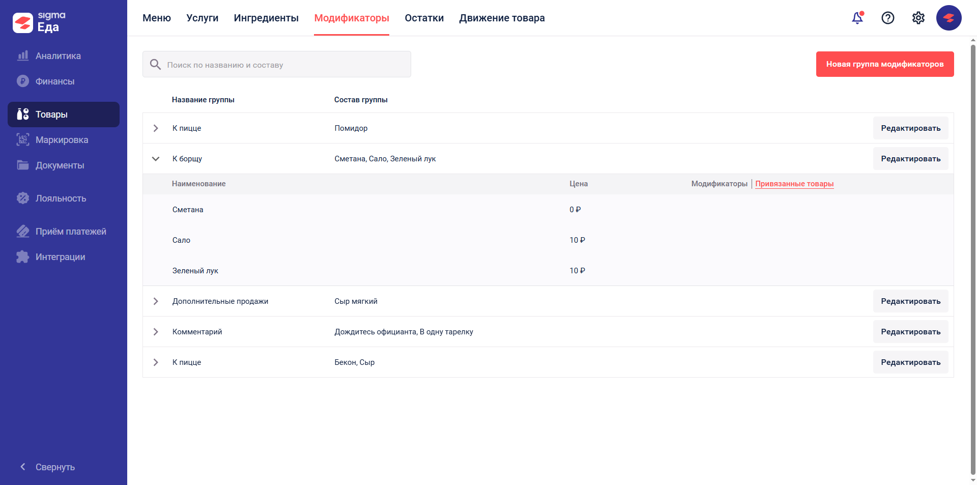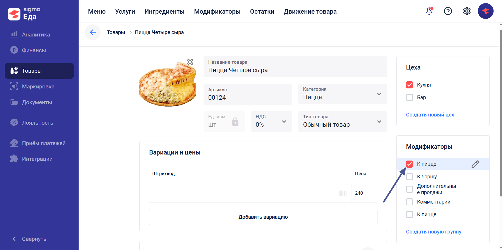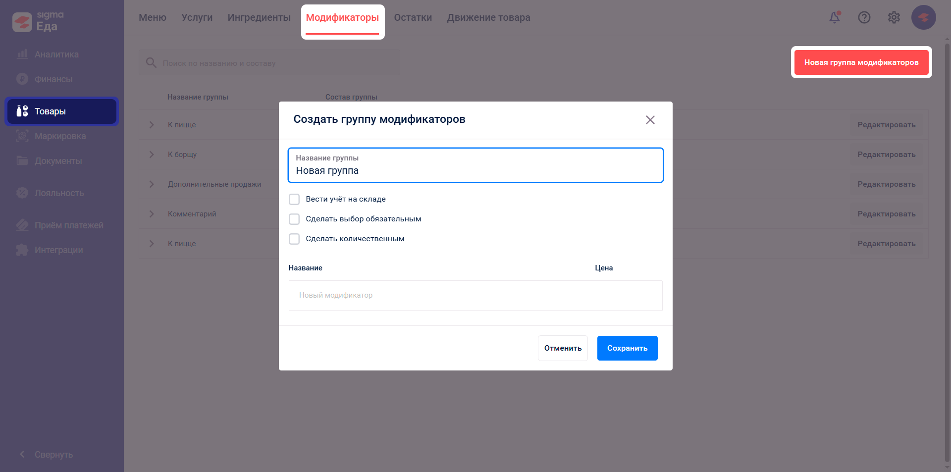 - Перейдите во вкладку «Товары» → «Модификаторы»