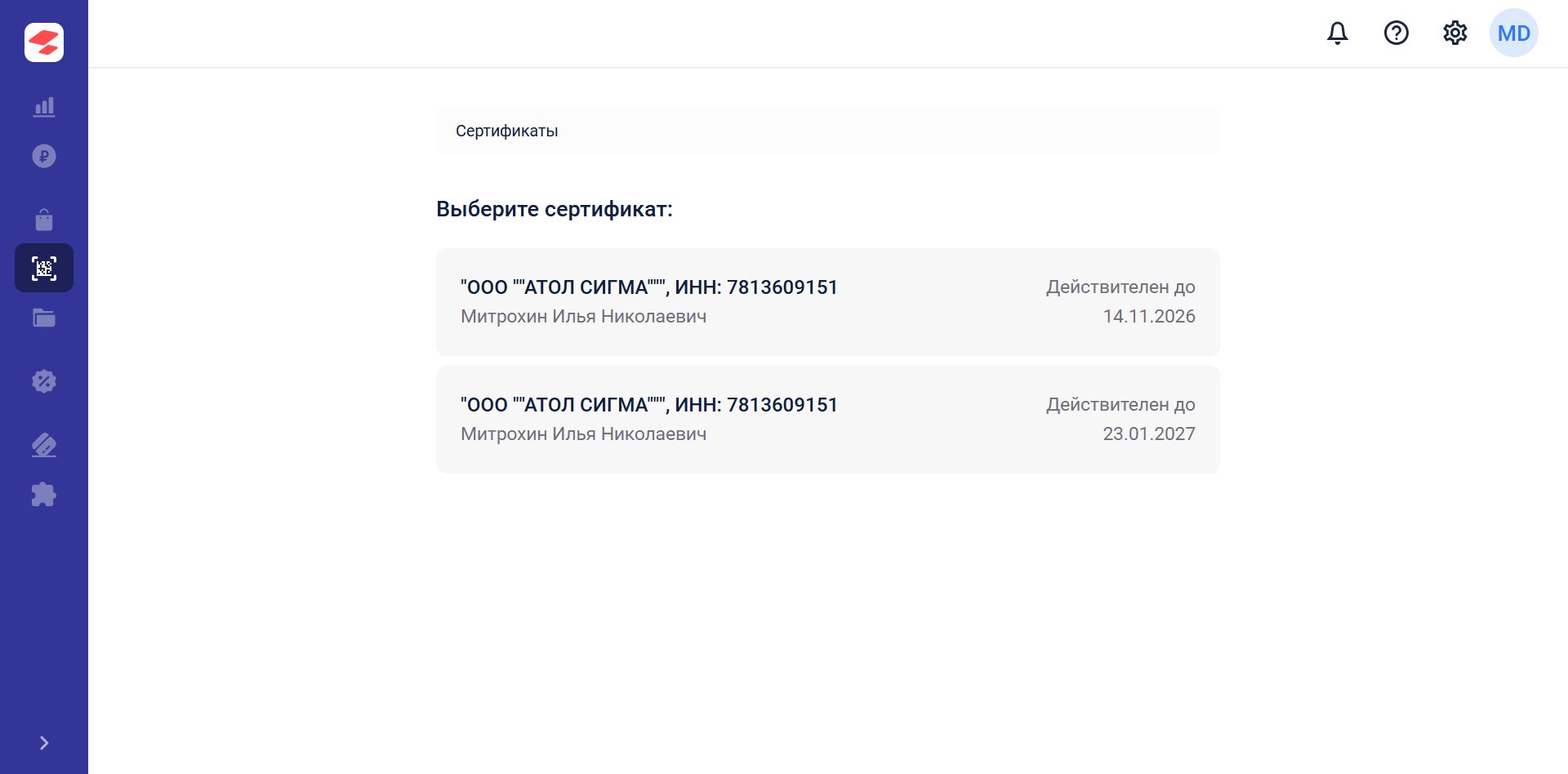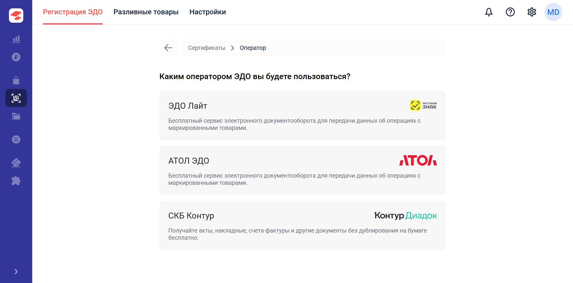 После выбора сертификата выберете Контур.Диадок.