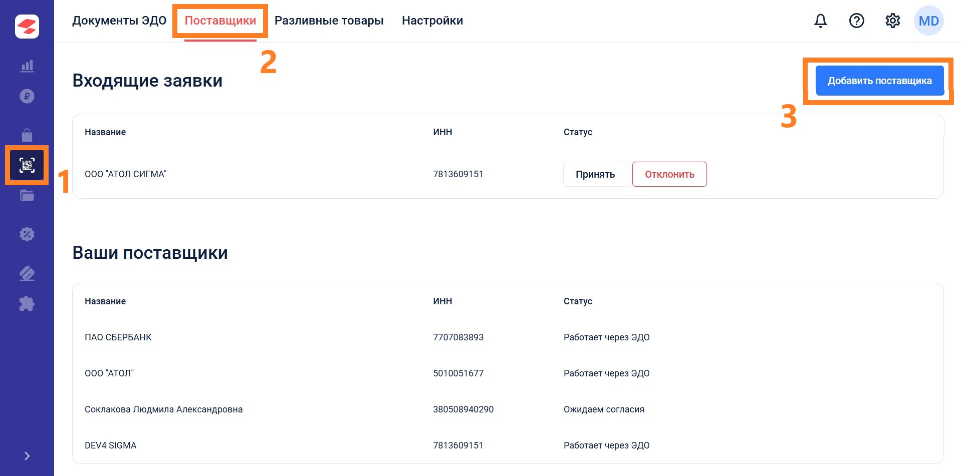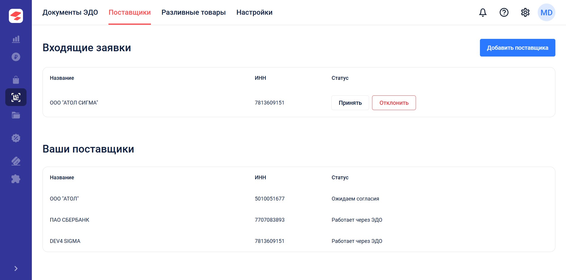 В личном кабинете SIGMA доступна работа с входящими приглашениями. Они отображаются во вкладке Поставщики. Для установки связи требуется принять приглашение. Если приглашение отправлено ошибочно, то рекомендуем от него отказаться.