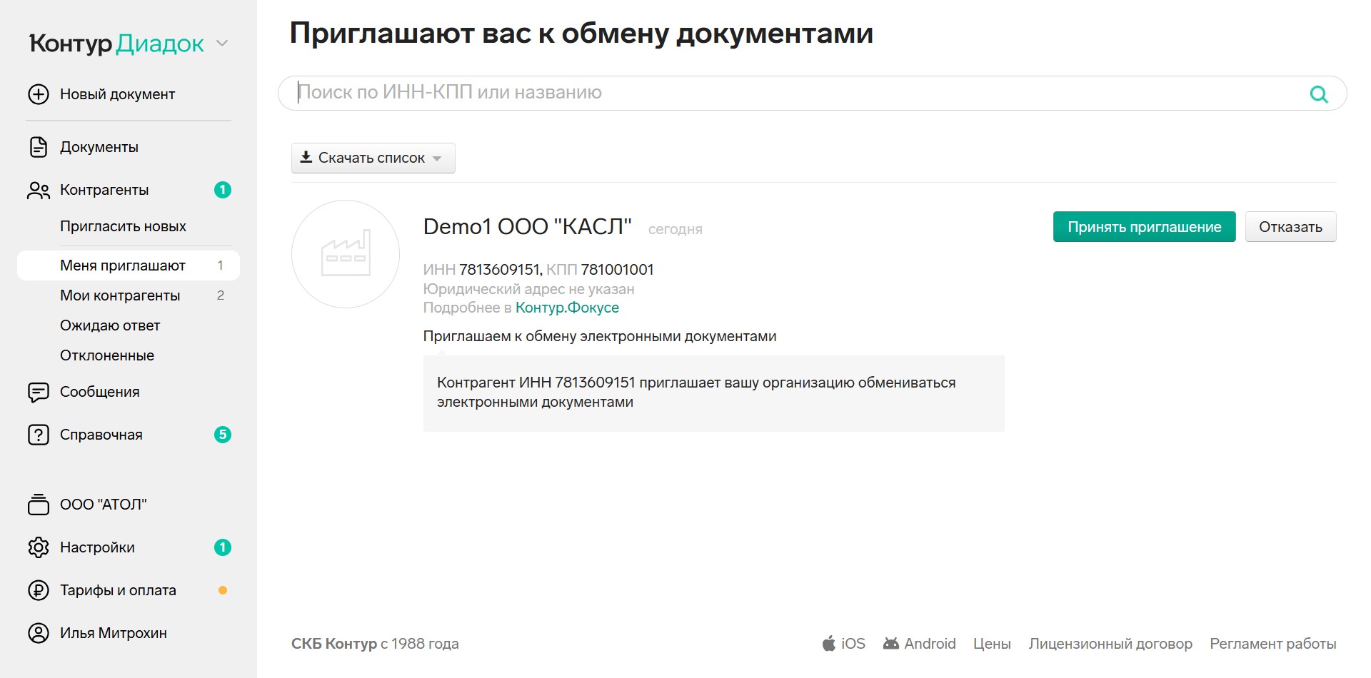Необходимо уведомить своего поставщика, и после подписания приглашения он сможет отправить УПД. В личном кабинете Контур.Диадок входящее приглашение нужно искать в разделе Контрагенты - Меня приглашают.