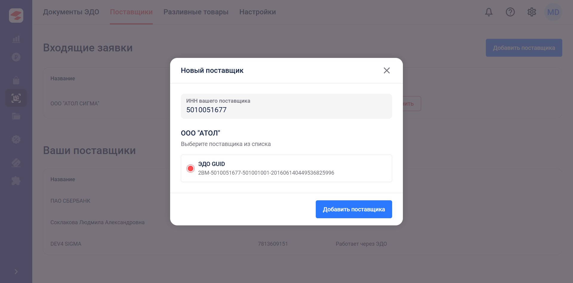 Поиск поставщика осуществляется по ИНН. Система найдет все доступные для отправки приглашения ящики поставщика. Выберите необходимый и Добавьте поставщика.